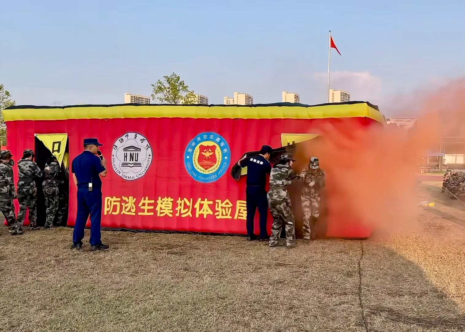 为切实推进新生安全教育工作,强化新生的消防安全意识,提升应急疏散逃生和扑救初期火灾处置能力,9月20日下午,淮阴师范学院特邀淮阴区消防救援大队王营消防救援站,于田径场联合举办了2025级新生疏散逃生与灭火演练活动。党委保卫部副部长、保卫处副处长丁光明,淮阴区消防救援大队副大队长陈涛以及相关消防员参与了此次演练。
